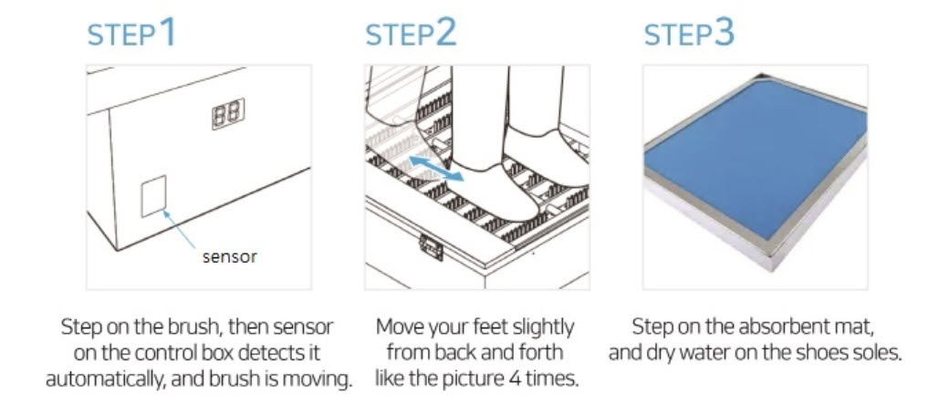 Khi bạn bước lên bệ máy, cảm biến sẽ phát hiện, lúc đó bàn chải sẽ hoạt động và kết hợp với nước để làm sạch bụi bẩn bám vào các khe hở trên đế giày. Sản phẩm này rất hiệu quả trong việc giữ cho môi trường làm việc của bạn luôn sạch sẽ.